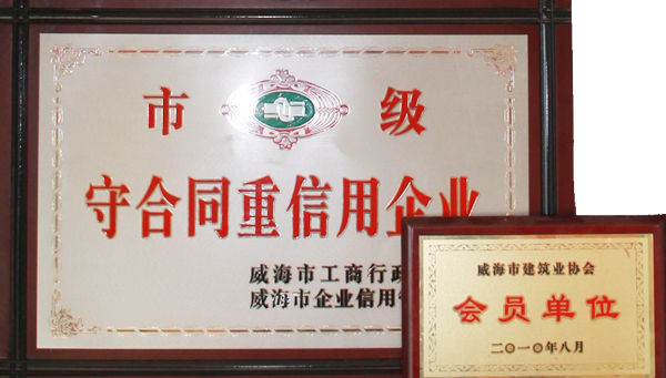 公司連續(xù)八年榮獲威海市“誠信開發(fā)企業(yè)”、“建筑施工誠信企業(yè)”,連續(xù)九年被評(píng)為威海市級(jí)“守合同重信用企業(yè)”,多次被評(píng)為威海市“市級(jí)文明單位”、“質(zhì)量管理先進(jìn)企業(yè)”、 “安全管理先進(jìn)企業(yè)”,乳山市“優(yōu)秀企業(yè)”、“先進(jìn)民營企業(yè)”、“納稅明星企業(yè)”,在社會(huì)上逐步樹立了誠信、穩(wěn)健的企業(yè)形象。